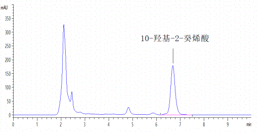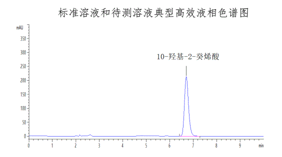 10-羥基-2-癸烯酸標準系列工作液:分別準確吸取10-羥基-2-癸烯酸標準儲備液0.02mL、0.10mL、0.20mL、0.50mL、1.00mL于 10.0mL容量瓶中,用無水乙醇稀釋至刻度,搖勻,得濃度分別為2.0ug/mL、10.0ug/mL、20.0ug/mL、50.0ug/mL、100ug/mL的標準系列工作液。