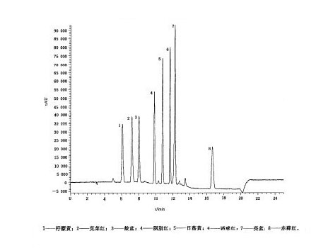 食品中人工合成著色劑用聚酰胺吸附法或液液分配法提取,制成水溶液,注入高效液相色譜儀,經反相色譜分離。