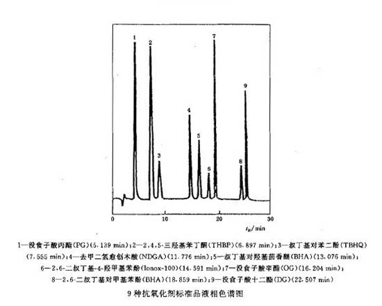 抗氧化劑標準品:沒食子酸丙酯(PG)、2,4,5-三羥基苯丁酮(THBP)、叔丁基對苯二酚(TBHQ)、去甲二氫愈創木酸(NDGA)、叔丁基對羥基茴香醚(BHA)、2,6-二叔丁基-4-羥甲基苯酚(Ionox-100)、沒食子酸辛酯(OG)、2,6-二叔丁基對甲基苯酚(BHT)、沒食子酸十二酯(DG)。
