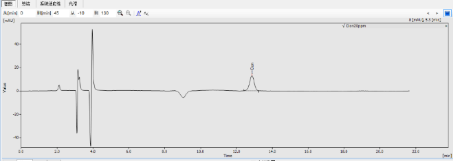 標準儲備液: 準確稱取一定量標準品,用甲醇+乙腈(1+1)溶解,配成0.1mg/ml的標準液。標準工作液:根據使用需要準確吸取一定量的嘔吐毒素儲備液,用流動相稀釋,分別配成相當于1μg/ml、2μg/ml、5μg/ml、10μg/ml、20μg/ml的標準工作液。用0.45μm的有機系濾膜過濾,精密量取10μL,注入液相色譜儀,記錄色譜圖。