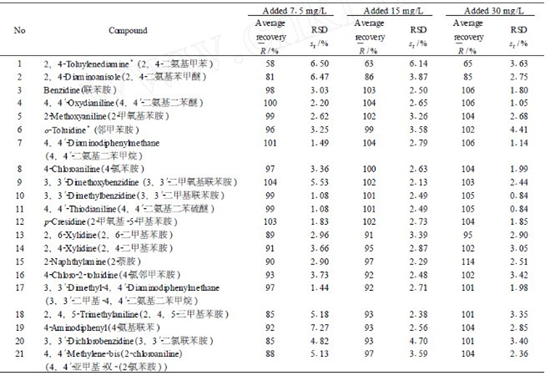 用此方法測定紡織品中的偶氮含量,較為省時且易于操作。除3, 3′-二甲基聯(lián)苯胺和4, 4′2 二氨基二苯硫醚色譜峰(圖1中10、11號峰)重疊, 2, 6二甲基苯胺和2, 4二甲基苯胺(圖1中13、14號峰)有少于重疊外,其它化合物均取得了很好的分離效果。以pH 6.0的檸檬酸鹽緩沖溶液模擬人體的汗液環(huán)境, 分別加入7.5、15、30 mg/L 3個水平的芳香胺標準品進行回收實驗, 每一水平分別做6個平行樣品, 相對標準偏差和平均回收率數(shù)據(jù)見表1。應用高效液相色譜法分離檢測了23種混合芳香胺, 取得了很好的分離效果, 滿足了國內(nèi)外相關標準及法規(guī)的新要求。