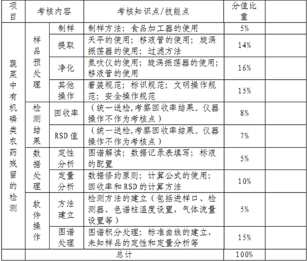 本項目全面考察學生對氣相色譜法檢測蔬菜中農藥殘留項目的實施過程中所涉及的樣品預處理、樣品檢測(送至第三方檢測機構進行,不作為考核點,但選手制備樣品的回收率和RSD值將根據檢測機構檢測數據計分)、數據處理(提供統一打印圖譜,考核選手根據圖譜計算檢測結果的能力)和離線色譜工作站操作4個環節的基本操作與過程的整體把握和運用能力以及在整個實驗過程中的操作文明和操作安全意識。